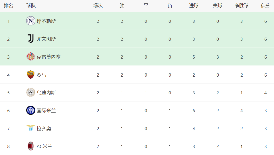 在积分榜上,那不勒斯2战拿到6分排名榜首。尤文图斯也是6分排名第2。克雷莫内塞这匹黑马也是2战全胜,拿到6分,但净胜球只有2球,排名第3。罗马2轮比赛都是1-0获胜,2粒进球换来6分,排名第4。乌迪内斯拿到4分,排名第5。而国际米兰、拉齐奥和AC米兰这3支球队都是1胜1负的战绩,只拿到3分。
